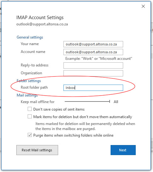 - Very important: once your account has been set up, you need to go back and change the folder rooting.